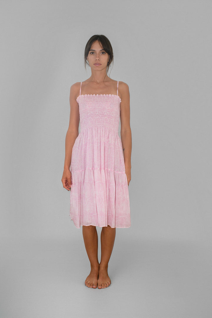 The Brooke Short Strap Dress is a midi-length breezy silhouette crafted from high-quality silky cotton. With shirred detailing at the bust, its a versatile piece that blends island elegance with comfort.