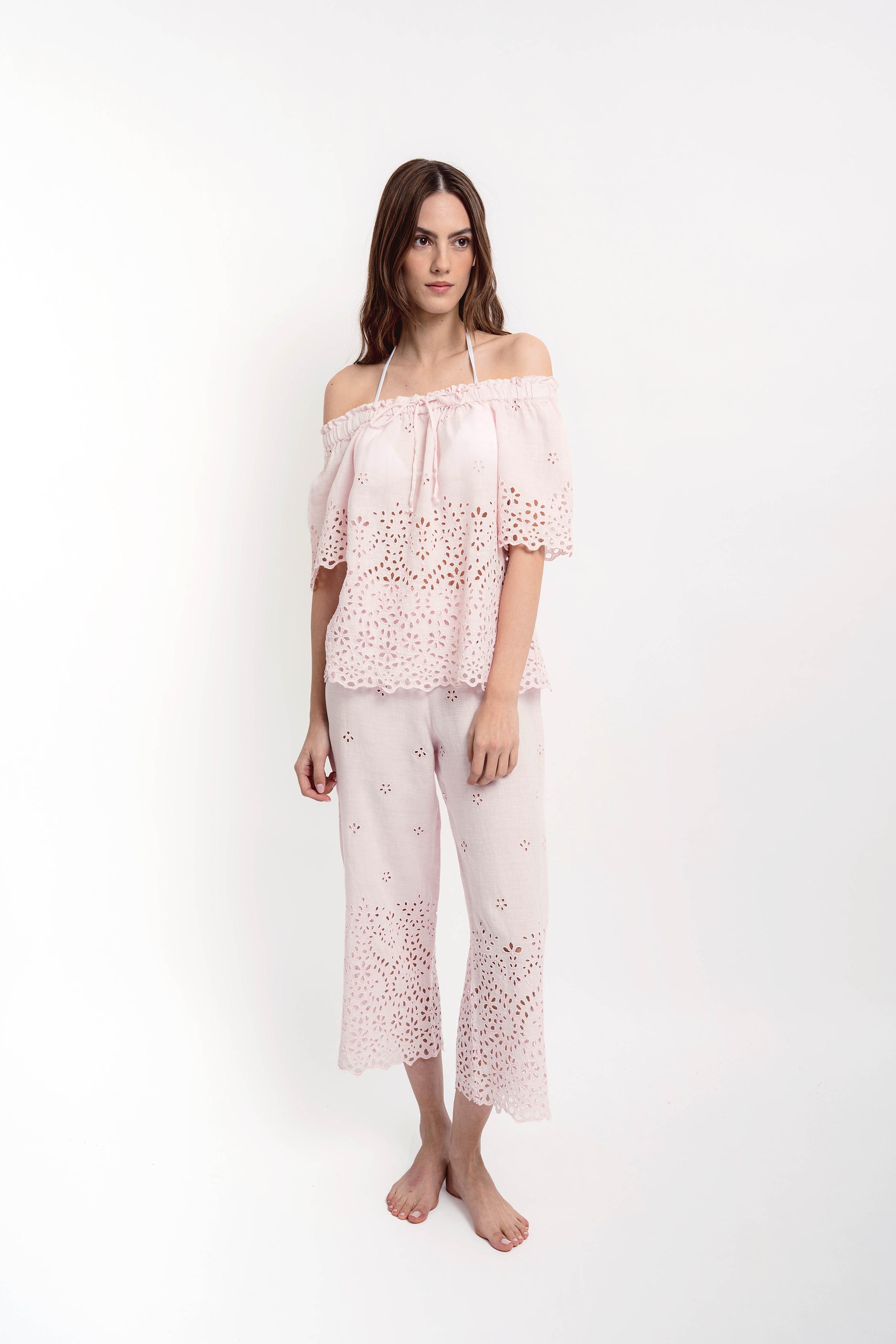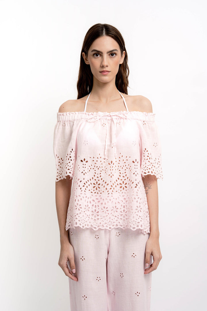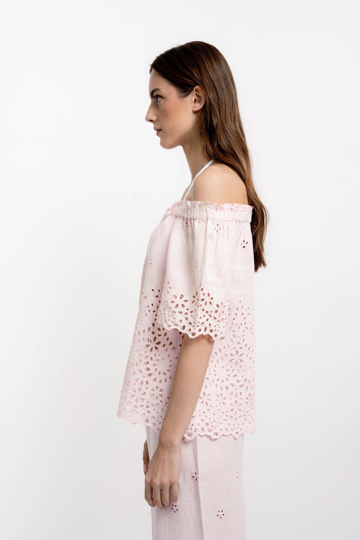 Christy Round Collar Shirt Cotton/Linen Broderie Light Pink