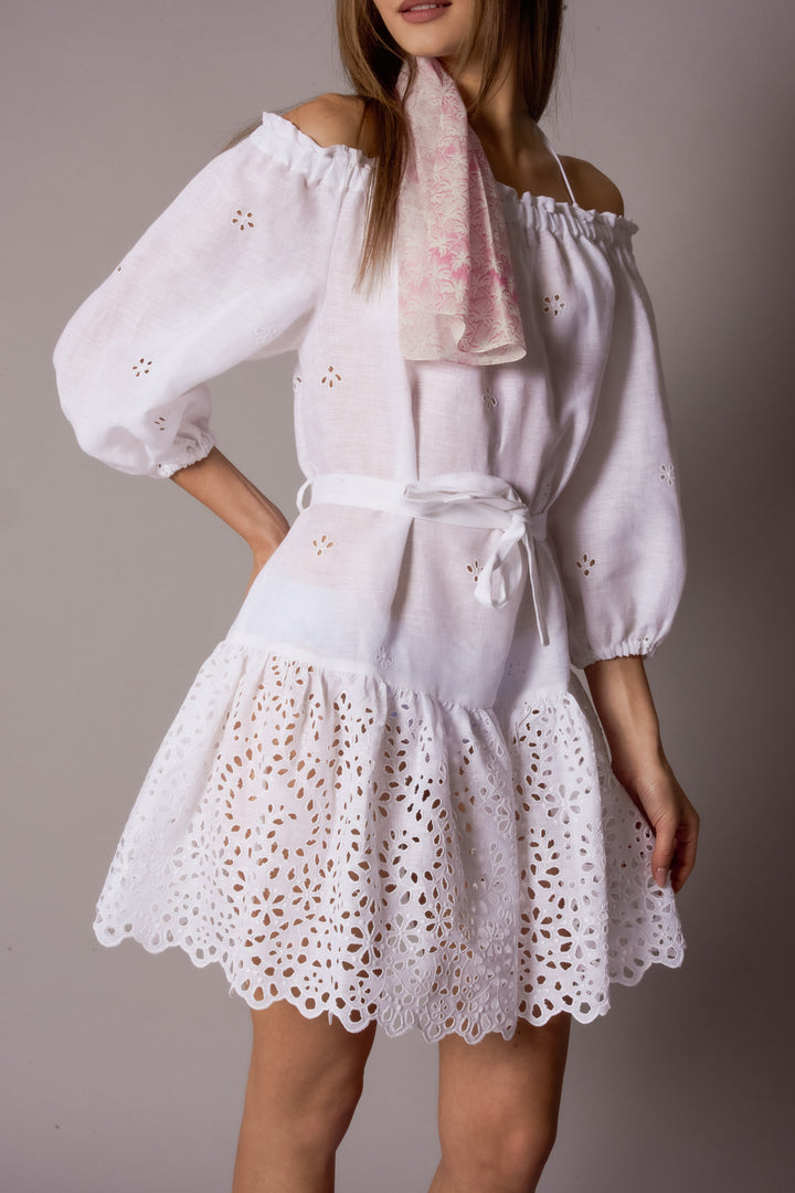 The Giselle dress in our signature broderie is cool, comfortable, and delicate. With a breezy, drop waist silhouette this dress is perfect for a relaxed day out or a cozy evening by the sea.
