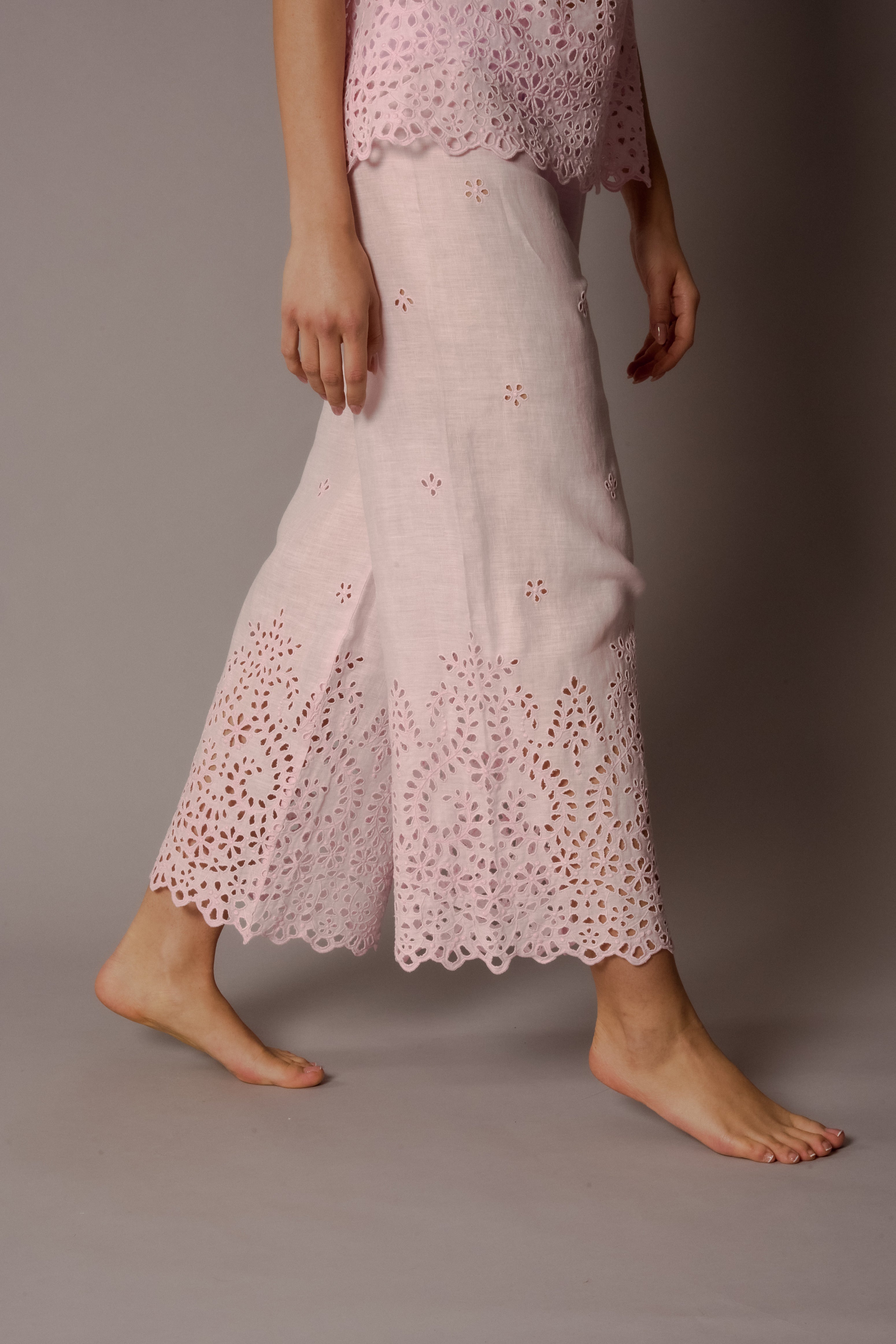 Our light pink Linda trouser is a wide leg silhouette with our intricate broderie detailing at the leg. Our signature light pink colorway pairs well with bare feet and an island mentality.