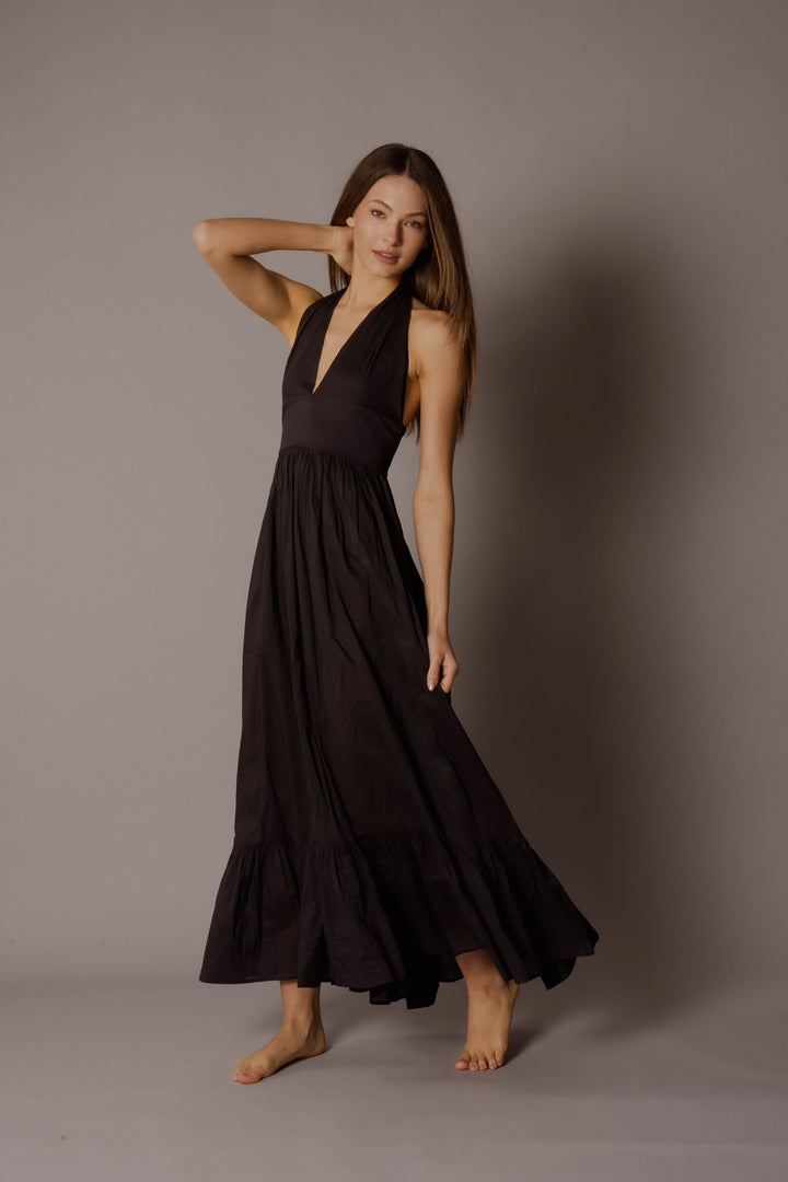 The Nikki dress is a cotton maxi dress, perfect for summer nights. With its halter neck design and classic colorways, its a breezy piece to slip on after a long day in the sun. Composition: 100% CO