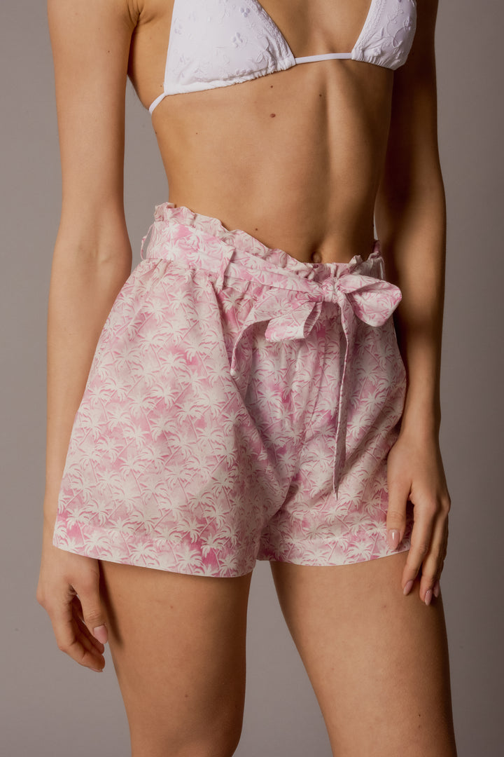 With a belted waist detail, the Noemi short in our signature linen is the perfect relaxed silhouette for every-day. Available in our fun palms print, this short comes in two timeless colorways, pink and light blue.